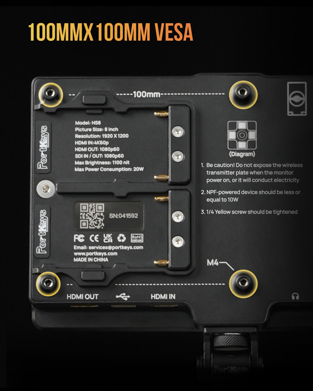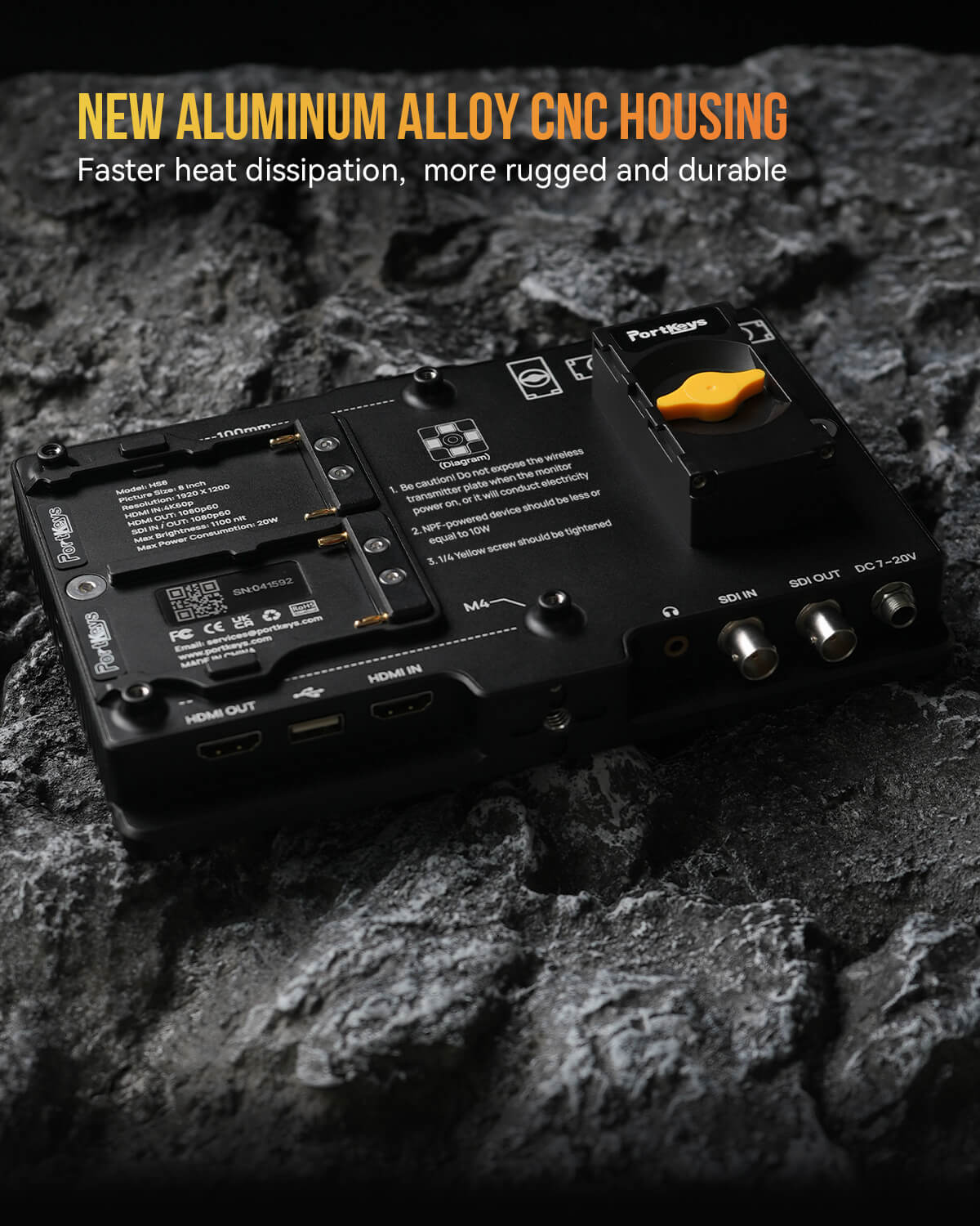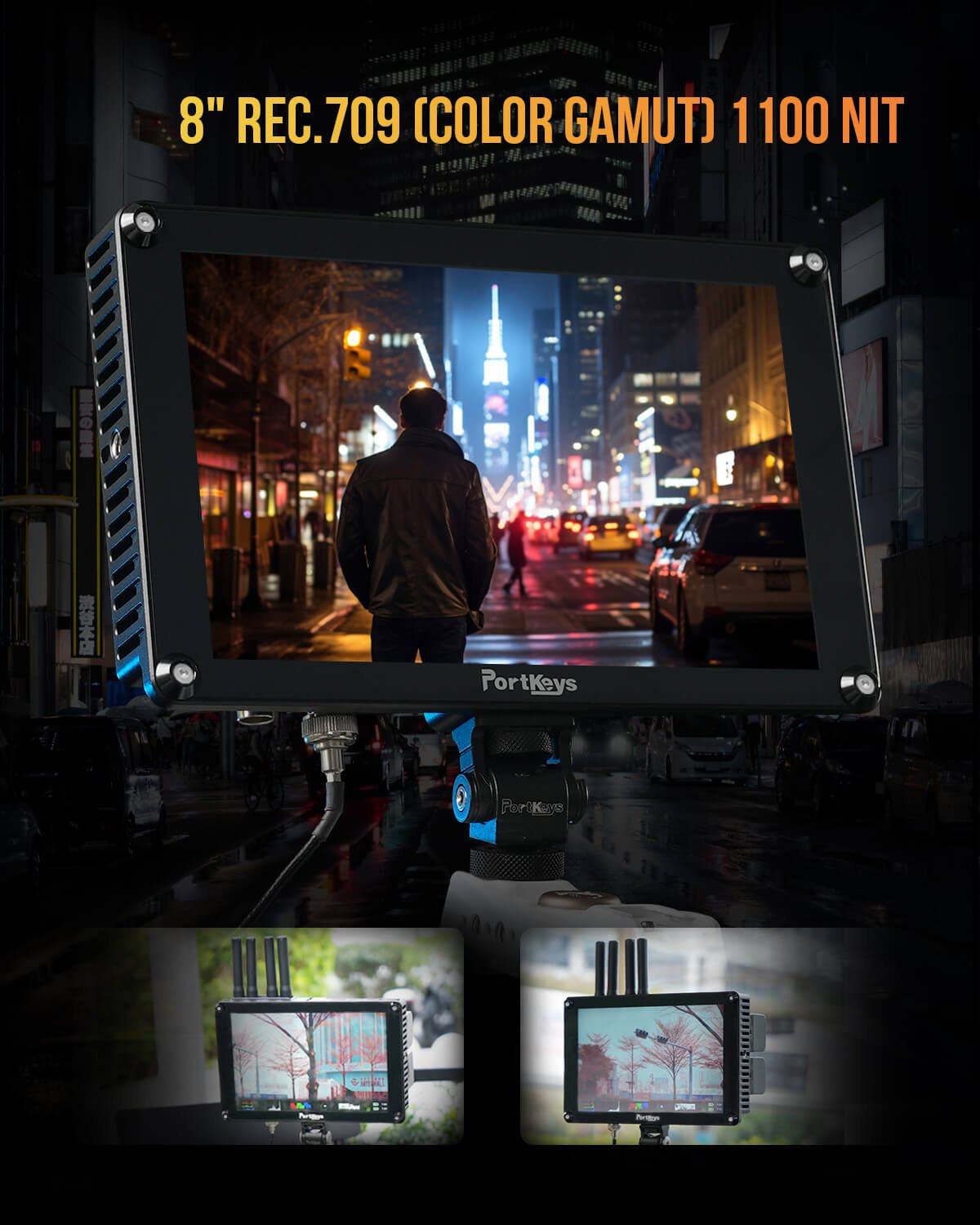 Portkeys HS8 je 8palcový režisérský monitor s jedinečnými funkcemi, které z něj dělají převratnou novinku pro filmaře a profesionály v oblasti videoprodukce. Monitor HS8 je zkonstruován tak, aby přežil i ty nejnáročnější natáčecí podmínky, má odolné celohliníkové pouzdro sodnímatelným a vyměnitelným ochranným sklem před displejem. S rozměry 208 x 133,7 x 50,5 mm a hmotností 675 g/1,48 kg se jedná o praktickou a kompaktní monitorovací jednotku, kterou můžete sdílet s kamerovým štábem, tahounem ostření, režisérem nebo klientem.