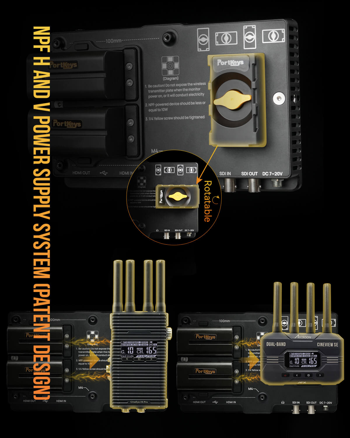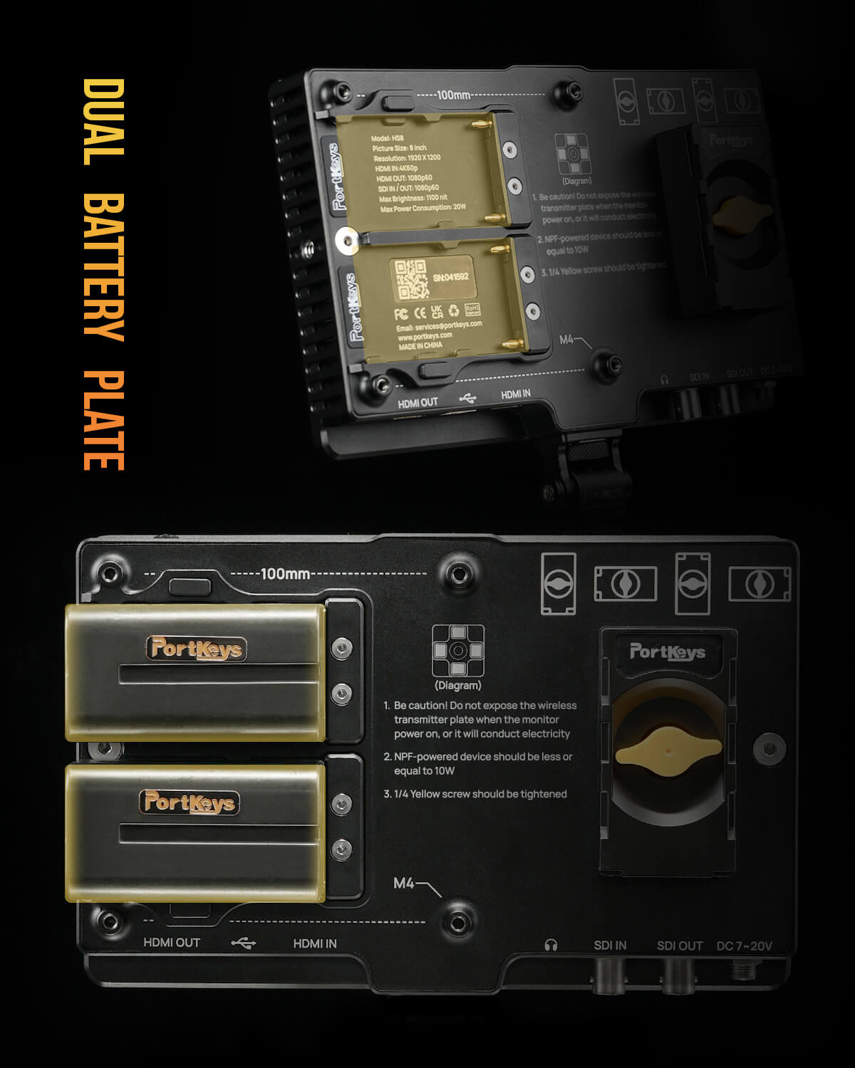 To však není vše; to, co monitor HS8 odlišuje od konkurence a činí jej jedinečným, je přidání odnímatelné a otočné atrapy baterie Sony NP-F s výstupním výkonem. Tato deska s vestavěnou atrapou baterie Sony NP-F s průchodem napájení (8 V/10 W), kterou si nechala společnost Portkeys patentovat, umožňuje připojit a napájet bezdrátový videopřijímač přímo na zadní straně monitoru HS8. Tento bateriový napájecí adaptér můžete bez použití nářadí otáčet o 360° pomocí velkého žlutého knoflíku uprostřed.