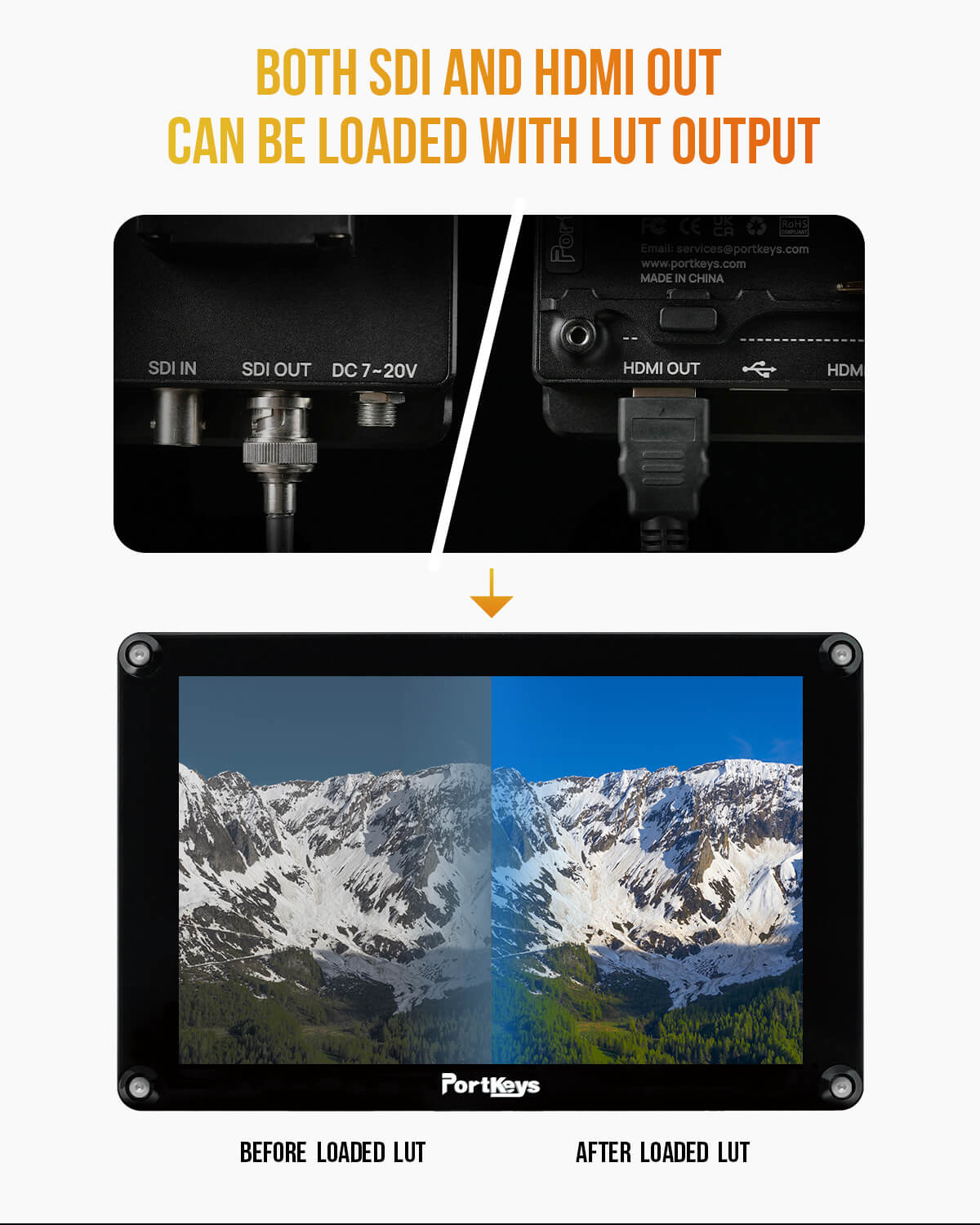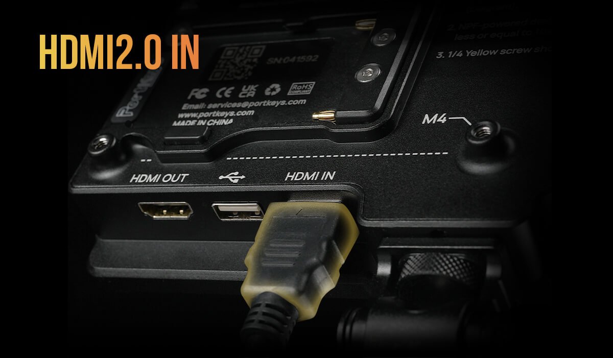 Ve spodní části monitoru najdete všechny vstupní/výstupní porty pro video a napájení, které jsou pohodlně zapuštěny, aby byly konektory chráněny a nedošlo k jejich náhodnému poškození. Portkeys HS8 je vysoce univerzální a je vybaven všemi video porty, které můžete od profesionálního monitoru očekávat, včetně jednoho portu HDMI 4K DCI 60p a jednoho portu pro vstup videa 3G-SDI 1080P60. Dále je k dispozici jeden výstupní port HDMI a jeden výstupní port 3G-SDI, které oba podporují rozlišení až 1080P60. Křížová konverze je možná ze vstupu HDMI na výstup SDI a ze vstupu SDI na výstup HDMI. A konečně, přes výstup SDI a HDMI můžete vyvést 3D LUT, aby byla zachována konzistence v celém řetězci monitorování videa.