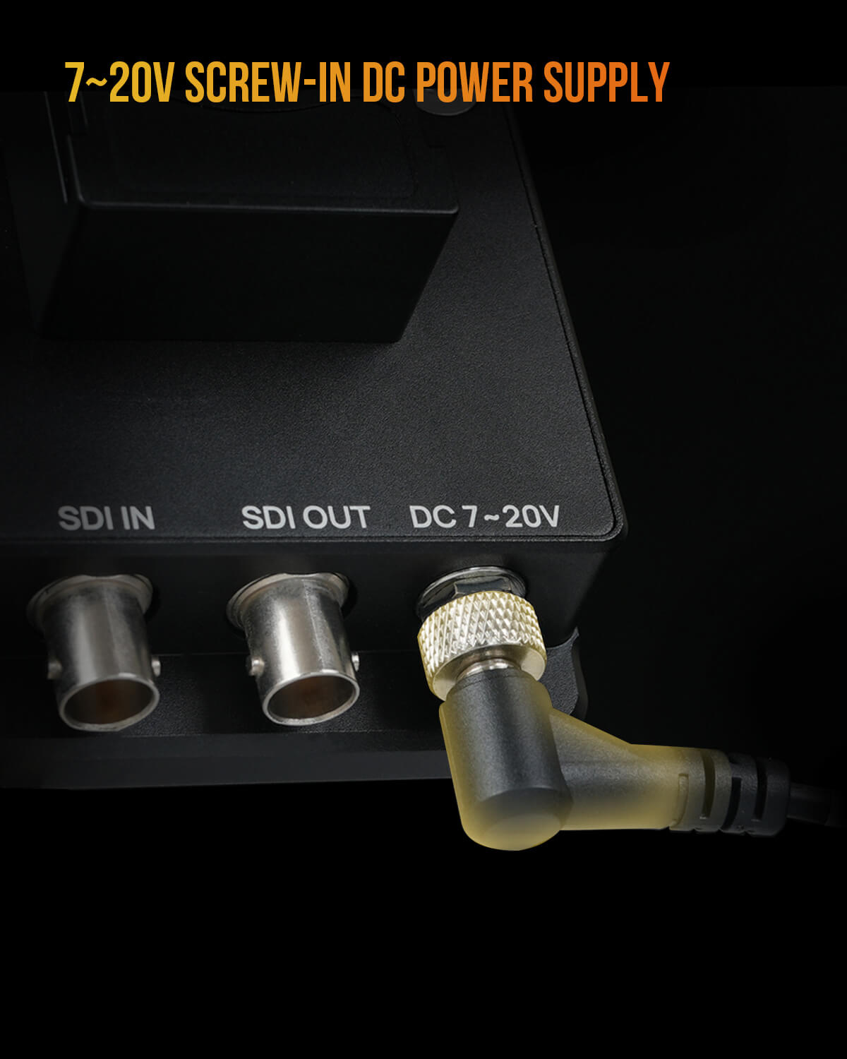 Spodní část modelu Portkeys HS8 je také vybavena 3,5mm konektorem pro sluchátka a portem USB-A pro budoucí aktualizace firmwaru a nahrávání vlastních LUT. Dále zde najdete vstup pro napájení DC 7-20 V s uzamykatelným stejnosměrným 5,5×2,1mm soudkovitým konektorem pro dlouhodobé napájení monitoru prostřednictvím baterie V-Mount/Gold Mount a přiloženého napájecího kabelu D-TAP na šroubovací DC.