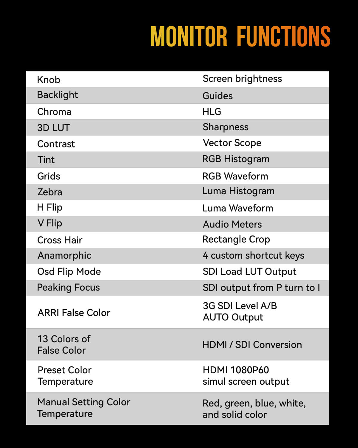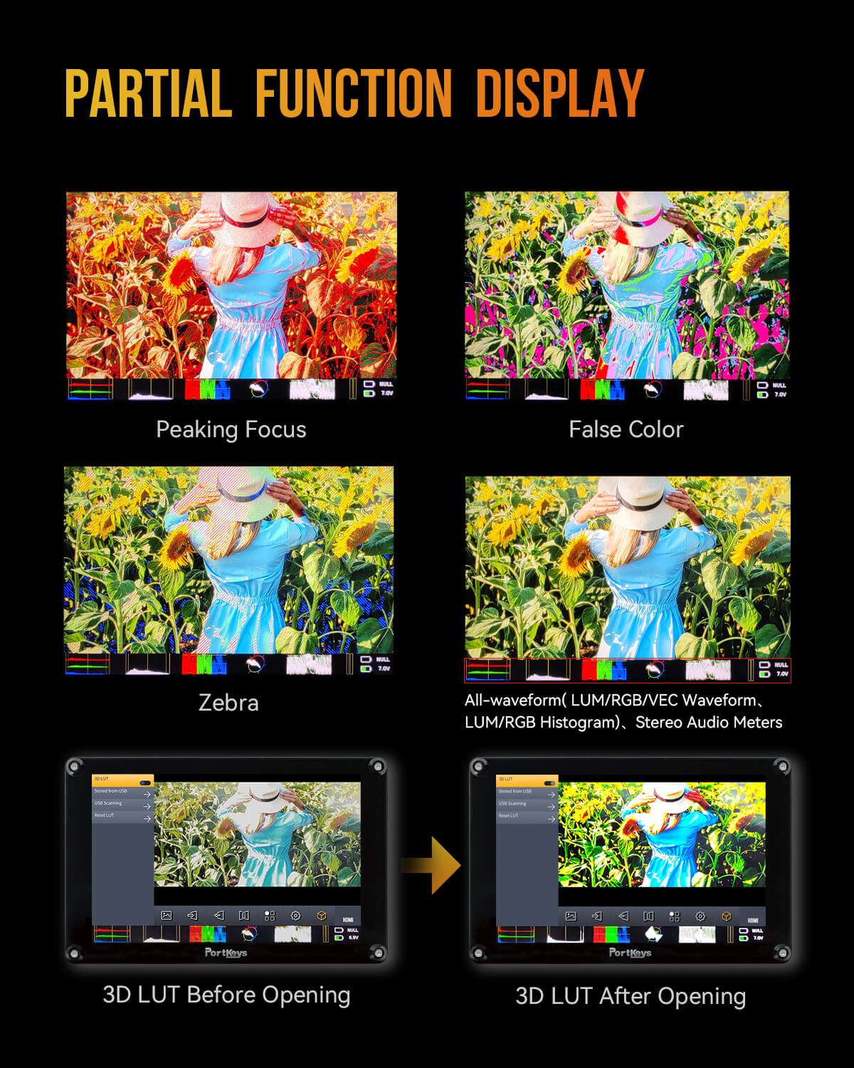 Monitor Portkeys HS8 vám také umožní činit zásadní rozhodnutí na place a mít jistotu v obraze díky kompletní sadě monitorovacích nástrojů, mezi které patří např: