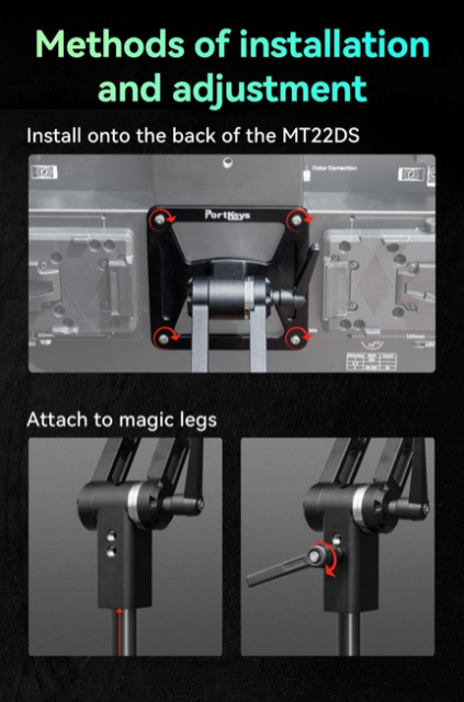 Držák Portkeys MT22DS VESA je univerzální montážní držák určený pro monitor MT22DS, který nabízí naklonění ±90° a otočení ±360° pro flexibilní nastavení úhlu, snadnou instalaci přímo na zadní stranu monitoru nebo pomocí magických nožiček a velikost kompatibilní s VESA 120 mm x 246 mm.