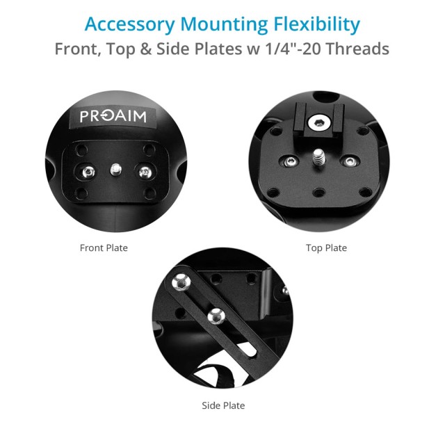 Má také přední, horní a boční montážní desky s několika závity 1/4”-20, které podporují různé možnosti upevnění kamer, externího napájení a dalšího příslušenství, jako jsou malé video světlo nebo mikrofon.