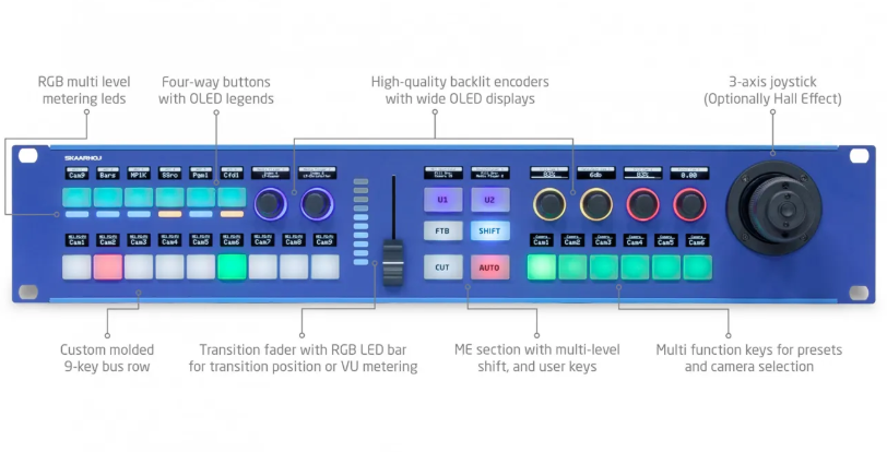 SKAARHOJ Rack Fusion Live s technologií NKK, Hallovým joystickem a architekturou Blue Pill Inside je špičkový modulární ovládací panel do racku určený pro profesionální vysílání, živou produkci a prostředí s více kamerami. Je postaven na architektuře Blue Pill Inside od společnosti SKAARHOJ a nahrazuje tradiční externí konfigurační systémy integrovaným zpracováním, což umožňuje flexibilní a škálovatelné ovládání zařízení ATEM, vMix, TriCaster, Livestream Studio a široké škály IP PTZ kamerových systémů.
