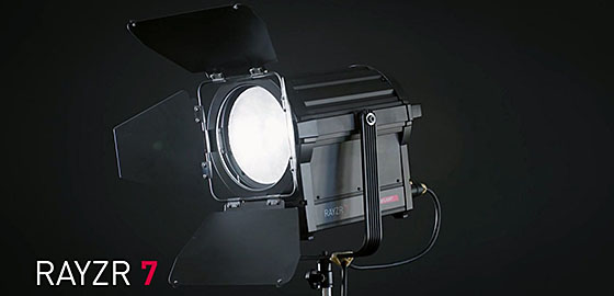 Černé 7" 200W LED Fresnelovo světlo pro denní svícení od společnosti Rayzr nabízí celkový výkon 200 W (100 W + 100 W) a využívá pasivní systém chlazení par. Nabízí barevnou teplotu 5600 K (denní světlo) a vyzařovací úhel 18° až 50°. Světlo je dodáváno s ovládáním RJ45 DMX in/out a vestavěným ovladačem. Kromě 7" LED Fresnelu obsahuje prémiové balení také čtyřkřídlé stínítko, napájecí zdroj a cestovní kufřík.