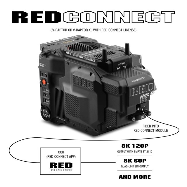 Modul RED Connect se připojuje ke kamerám V-RAPTOR nebo V-RAPTOR XL (V-Lock) a umožňuje živý streaming 8K videa pomocí služby RED Connect. RED Connect umožňuje uživatelům streamovat soubory RAW R3D přímo z kamerových systémů V-RAPTOR a V-RAPTOR XL po IP do řídicí jednotky kamery (CCU) v reálném čase, což otevírá mimořádnou škálu kreativních aplikací od živého vysílání přes virtuální produkci až po skutečnou 8K VR produkci.