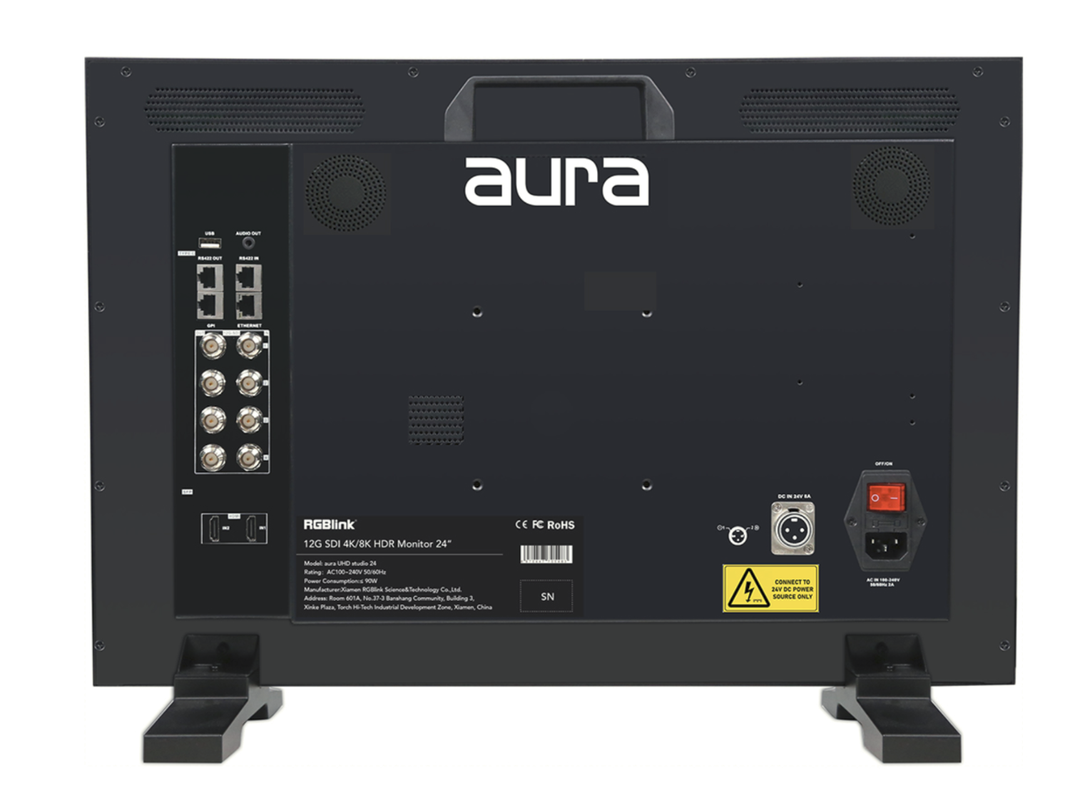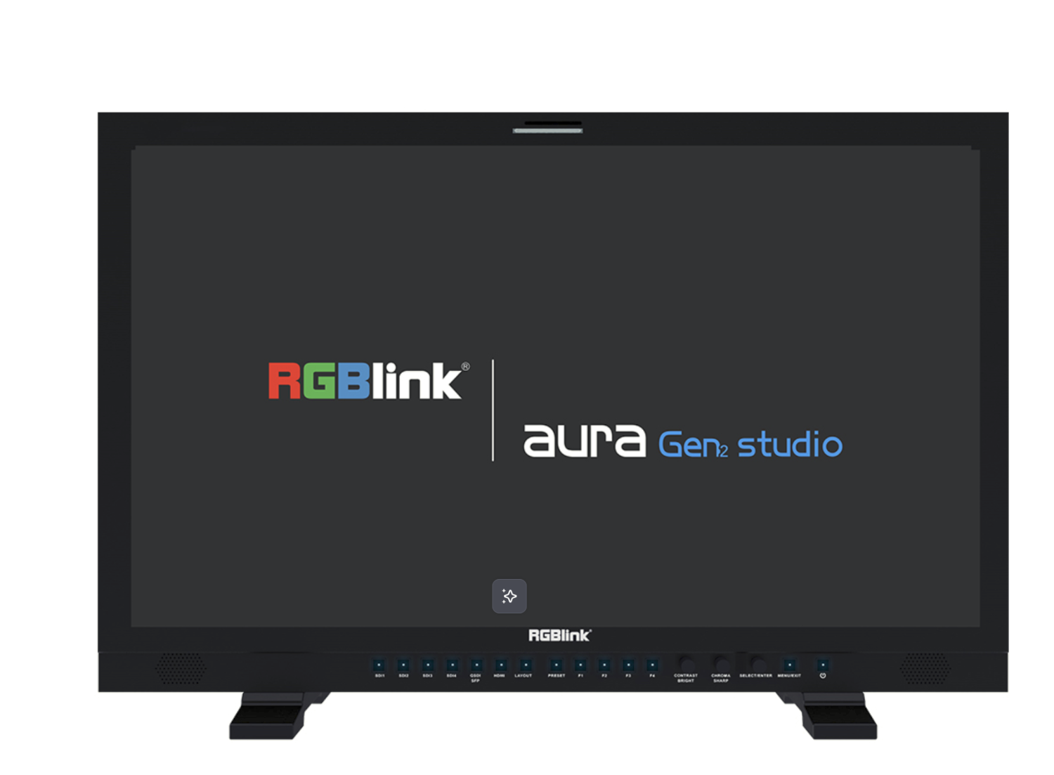 RGBlink Aura UHD Studio 24 Gen 2 je 23,8palcový monitor UHD 4K HDR IPS nové generace určený pro vysílání, film a profesionální postprodukční pracovní postupy. Monitor nabízí rozlišení 3840 × 2160, jas 1000 nitů a plný 100% barevný gamut DCI-P3, což zajišťuje přesné a konzistentní barvy pro kritické produkční práce. 10bitový panel IPS podporuje HDR gama křivky včetně PQ, HLG a S-Log3, stejně jako formáty kamerového logu, s možností importu vlastních 3D LUT pomocí tetraedrického interpolačního algoritmu pro přesné sladění barev na více displejích.