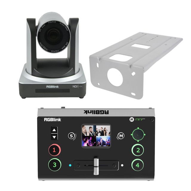Sada obsahuje kameru PTZ s držákem a směšovač RGBlink Mini Pro HDMI.