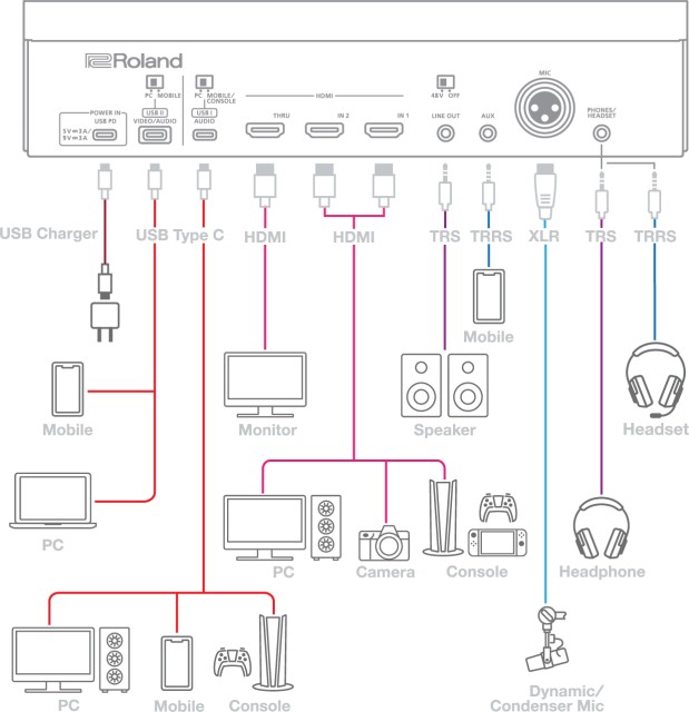 Díky Bridge Cast X se můžete soustředit na tvorbu – od online hraní až po podcasty, vlogy a další video obsah – a ne se trápit s kabely a různými specializovanými doplňky. Integrovaný design zjednodušuje připojení a snižuje kabelový nepořádek, zatímco intuitivní rozhraní umožňuje plynule mixovat zvuk a ovládat veškeré potřebné funkce. Díky několika portům USB-C a HDMI (najednou může být aktivní pouze jeden HDMI vstup, plynulé živé přepínání mezi HDMI vstupy není podporováno) můžete připojit všechna svá zařízení a vyhnout se tomu, abyste museli pokaždé, když budete chtít změnit sestavu pro naplánované streamování, ručně vše přepojovat.