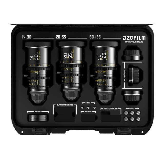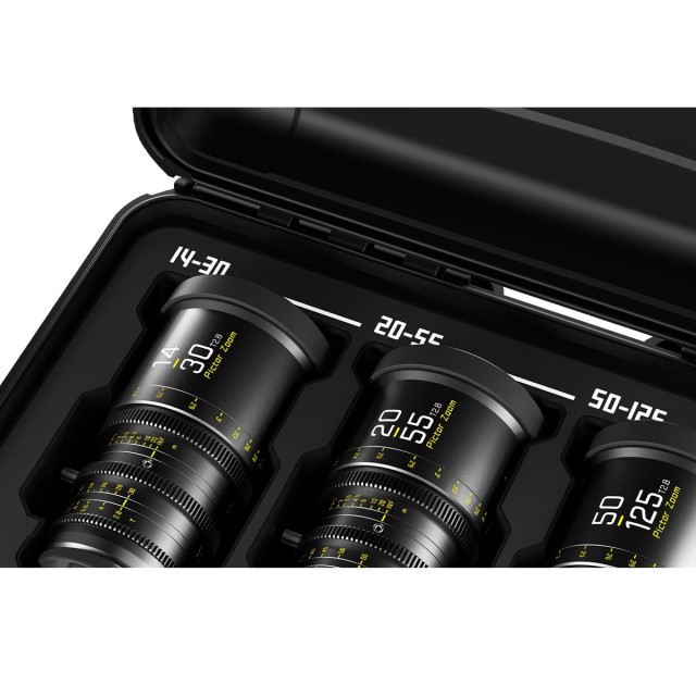 Sada 3 objektivů Pictor T2.8 Super35 Zoom od společnosti DZOFilm se skládá ze tří objektivů se zoomem - 14 až 30 mm, 20 až 55 mm a 50 až 125 mm - ve standardním černém provedení. Objektivy poskytují pokrytí rozšířeného rozsahu zoomu s relativně rychlou maximální clonou. Oba pokrývají snímače Super35 a mají podobnou délku, hmotnost, polohu převodovky a přední vnější průměr objektivu, což umožňuje rychlou výměnu objektivů.