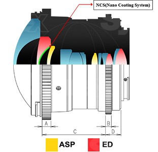 Asférické členy snižují barevnou aberaci k zajištění perfektní obrazové kvality a vysokého kontrastu ke středu a rohu snímku i v případě plně otevřené clony