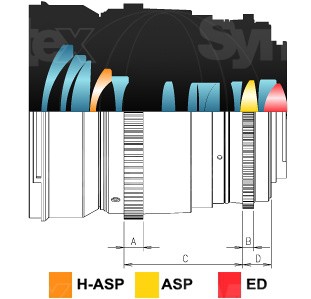 Hybridní asférické členy snižují barevnou aberaci a zajišťují dokonalou kvalitu obrazu a vysoký kontrast středu a rohů obrazu i při plně otevřené cloně