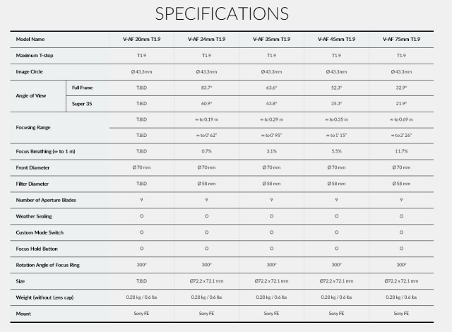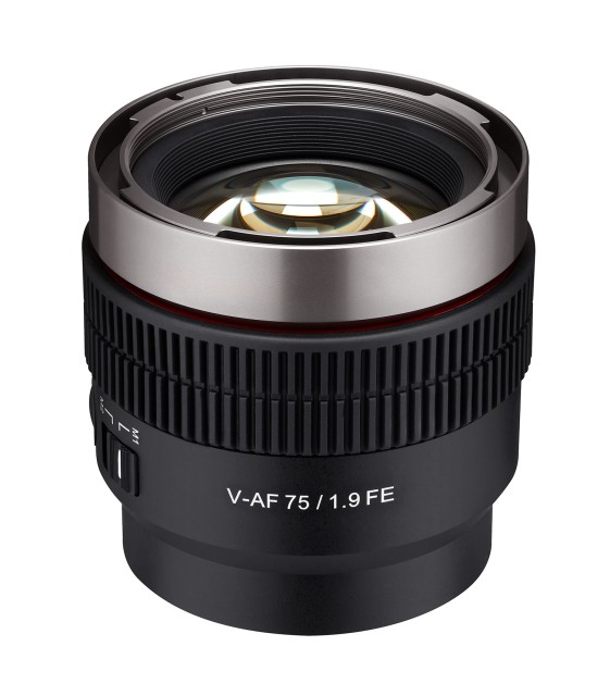 Řada filmových AF objektivů Samyang V-AF se soustředí na vysokou obrazovou kvalitu při minimalizaci rozměrů a hmotnosti těla (<300 g) pro maximálně snadné použití s kamerovými stabilizátory a drony. Řada nabízí několik různých pevných ohnisek (20, 24, 35, 45, 75, 100) se stejnými rozměry i sladěnou barevností, ozubeným ostřícím prstencem, a také clonou s 9 lamelami pro přirozené podání obrazu mimo hloubku ostrosti. Z řady mírně vybočuje model 100mm T2.3 FE délkou a světelností T/2,3. Objektivy Samyang V-AF poskytují velmi dobré optické rozlišení vhodné pro přístroje s až 4K a 8K snímači; zajímavostí je rovněž dvojice LED signalizujících běžící záznam, což dále usnadní použití objektivů na stabilizátorech apod. Tlačítko „Focus Save“ slouží k uzamčení nastavení zaostření během AF provozu, integrovaný přepínač „Custom Switch“ pak může sloužit např. k přepnutí funkce prstence z ostření na nastavení clony v režimu AF. První model řady, 75 mm T/1,9 FE (pro bajonet Sony FE), je v prodeji od 10/2022.
