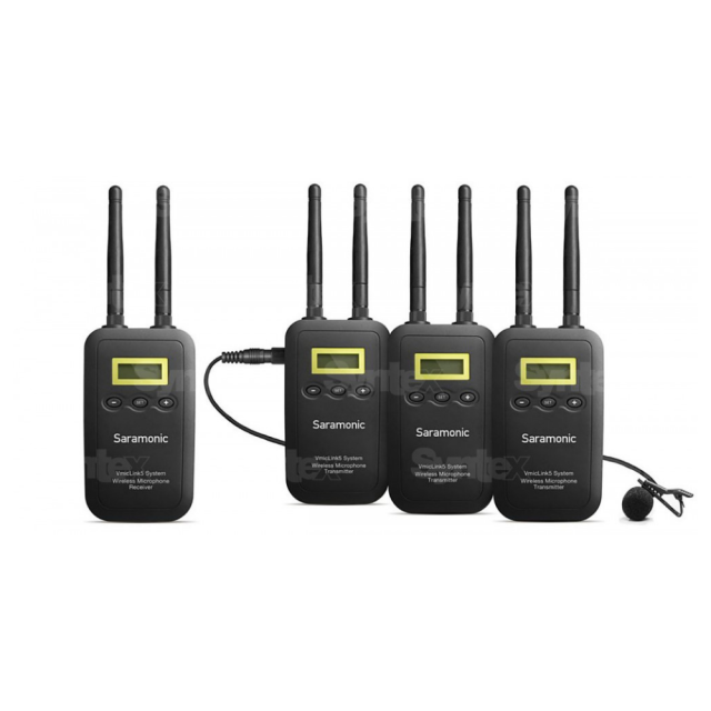 Saramonic VmicLink5 je digitální bezdrátový klopový mikrofonní systém pracující v pásmu 5,8 GHz, který obsahuje až tři miniaturní vysílače beltpack a jeden přijímač. Ideální pro nahrávání pomocí digitálních zrcadlovek a malých fotoaparátů, malých přenosných mixážních pultů a rekordérů.