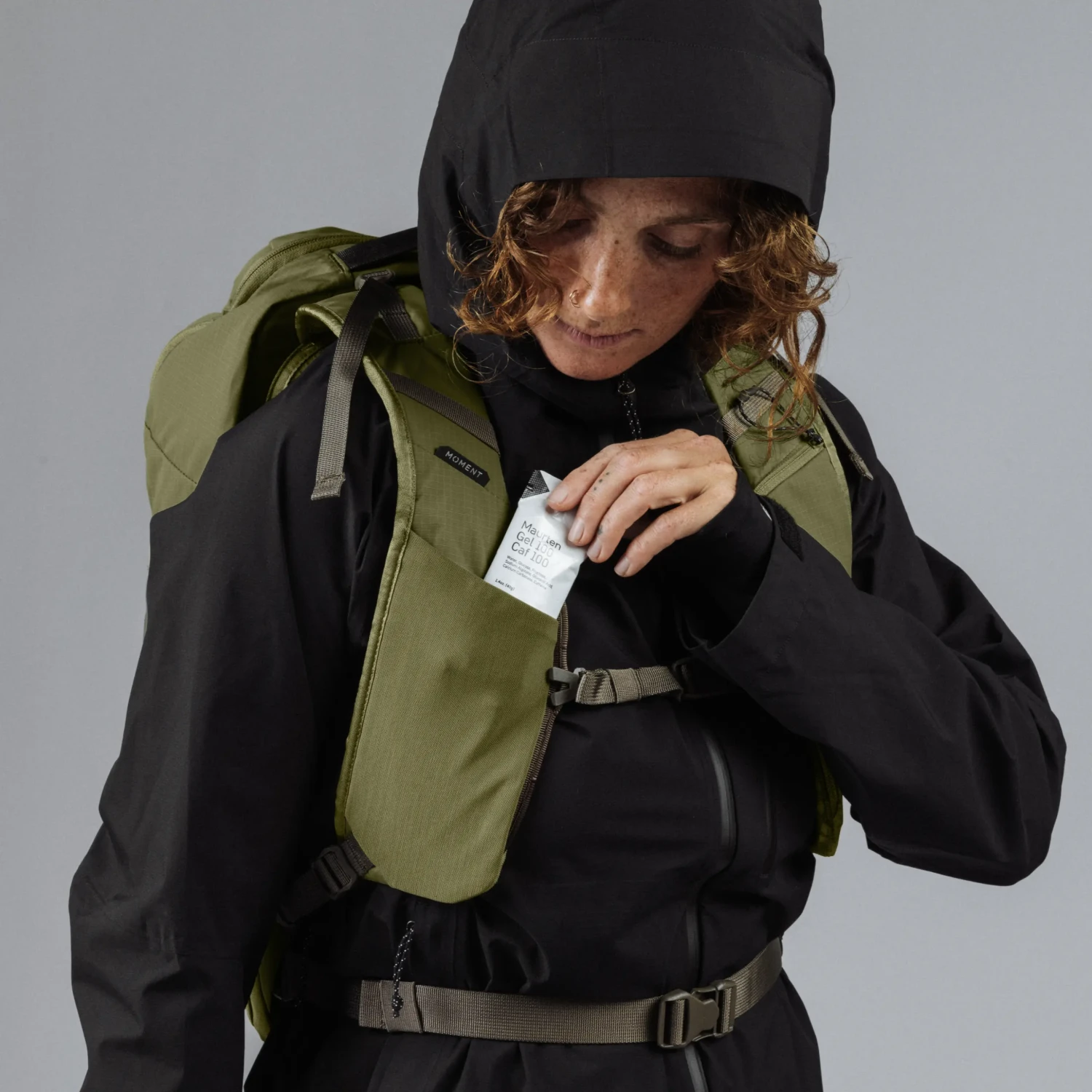 Materiál LightWeave™ Ripstop s dvojitou vrstvou DWR povrchové úpravy bez PFAS poskytuje vodoodpudivou ochranu. Magnetická klopa odvádí vodu od předního zipu, což snižuje průnik vody při lijáku.