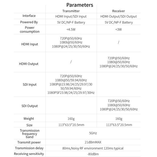 Sada vysílače a přijímače slouží k bezdrátovému přenosu až 1080p60 videa v pásmu 5 GHz na vzdálenost cca 182 m (přímá viditelnost) s latencí přibližně 80 ms. Systém nabízí HDMI a HD-SDI I/O (vysílač je vybaven 1x HDMI Type A a 1x HD-SDI vstupy, přijímač 1x HDMI Type A a 1x HD-SDI výstupy), napájení pomocí USB-C portu (případně pomocí akumulátoru Sony L-Series; není součástí) a možností přijímat signál nejen pomocí přijímače, ale také telefonů a tabletů. Obě jednotky mají pasivní chlazení pro tichý provoz, interní antény a skvěle čitelné stavové OLED displeje.