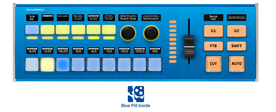 Ovládací panel SKAARHOJ Live Fly Controller s integrovaným modulem Blue Pill a tlačítky NKK je výkonný středně velký vysílací ovladač navržený pro živé produkční prostředí, které vyžadují přesné a přizpůsobitelné ovládání. Je navržen pro řízení produkcí s až osmi kamerami a nabízí vysoce flexibilní rozhraní vhodné pro přepínání, ovládání zvuku a práci s více zařízeními napříč platformami, jako jsou systémy vMix, TriCaster a ATEM.