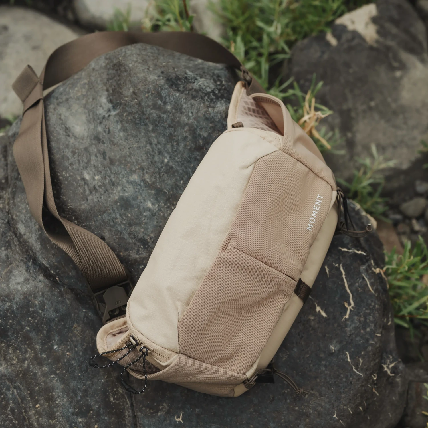 Moment Slate Sling 4L je taška navržena jako špičková ledvinka, která je stejně pohodlná i při nošení přes tělo. Její charakteristický nízkoprofilový design v oblasti pasu rovnoměrně rozkládá váhu po celém těle, takže zůstává pohodlná po celý den.