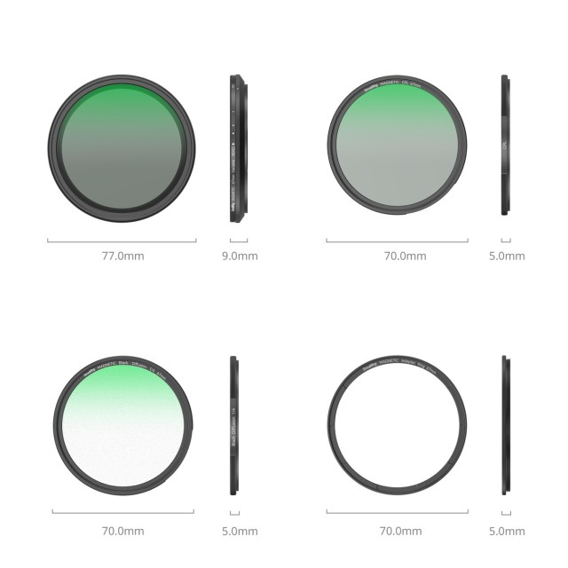 1. Sada obsahuje základní filtry VND, CPL a Black Mist, které se běžně používají při natáčení videa, a dále adaptérové kroužky se závitem a magnetickou krytku objektivu.Součástí sady je i bezplatné pouzdro na uložení.