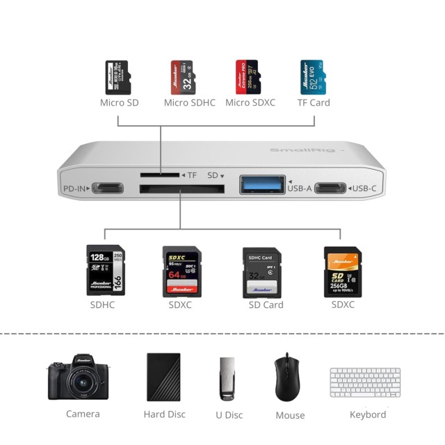 Díky dvěma portům USB-C a USB-A s rychlostí 5 Gb/s usnadňuje rychlý přenos souborů o velikosti 1 GB za pouhé dvě sekundy. Duální sloty pro karty SD / TF podporují současné čtení a zápis s maximální rychlostí čtení 100 MB/s a pojmou karty SD, SDHC, SDXC, Micro SD, Micro SDXC a Micro SDHC. Navíc nabízí univerzální kompatibilitu se systémy Android, iOS, Windows a macOS.