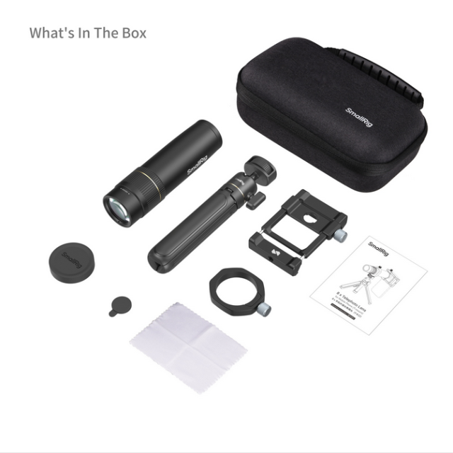 Instalace je snadná díky standardnímu bajonetu T, takže je kompatibilní s různými mobilními zařízeními. Abyste měli jistotu, že máte vše potřebné, je balení doplněno svorkou objektivu, stativem, adaptérem, krytkou objektivu, čisticím hadříkem a uživatelskou příručkou, které jsou pohodlně uloženy v úložné brašně pro snadný přístup a organizaci.
