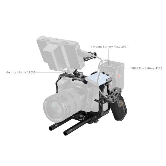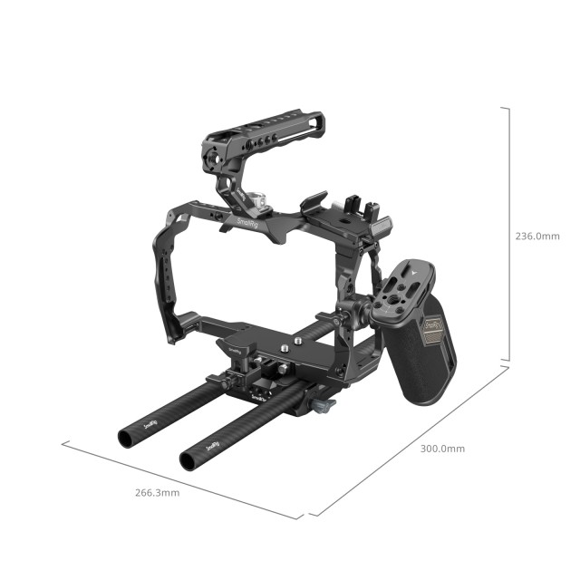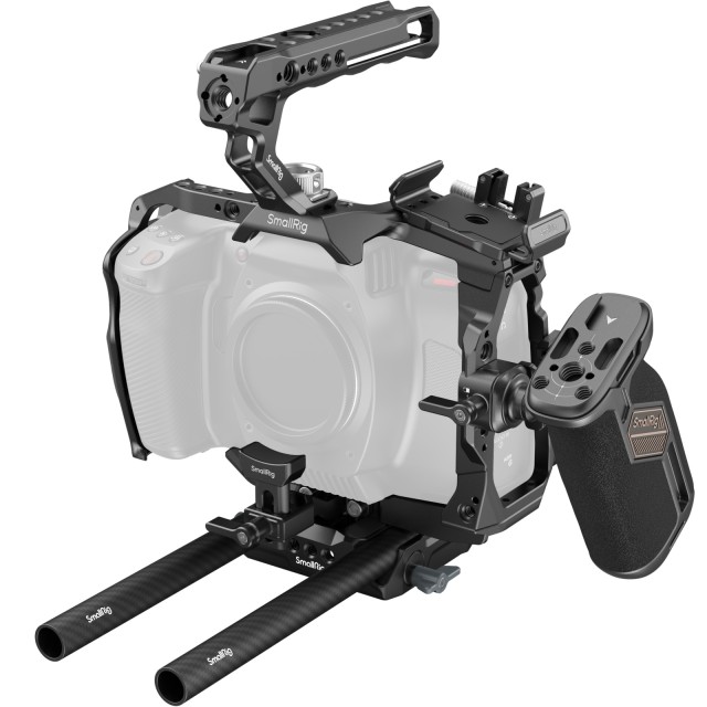 Sada SmallRig Advanced Cage Kit pro kameru Blackmagic Design Cinema Camera 6K 4575 je navržena tak, aby tvůrcům poskytovala pohodlné natáčení z nízkého úhlu, chránila kameru a nabízela více možností rozšíření příslušenství. Sada obsahuje klec, horní rukojeť, svorku pro kabel HDMI a USB-C, držák pro upevnění SSD, podpěru pro adaptér pro upevnění objektivu, dvě 15mm tyče z uhlíkových vláken a základní desku. Tříbodový uzamykací systém zajišťuje kameru dvěma šrouby 1/4"-20 na základně a šroubem 1/4"-20 na horní straně, zatímco integrované silikonové podložky zabraňují poškrábání. Klec poskytuje volný přístup ke všem rozhraním fotoaparátu, slotům na karty, výklopnému displeji a prostoru pro baterii.