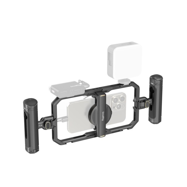 SmallRig All-in-One Video Kit For Smartphone Creators Quick Basic Edition 4597 představuje efektivní a kompaktní řešení pro profesionální natáčení videa pomocí chytrých telefonů. Sada obsahuje univerzální klec pro chytrý telefon, rychloupínací rukojeť s bezdrátovým ovládáním a boční rychloupínací rukojeť. Vylepšená univerzální klec je vybavena několika otvory se závitem 1/4"-20 a úchyty pro studenou patku, což umožňuje rozšíření o širokou škálu profesionálních videozařízení. Navíc umožňuje připevnění 67mm magnetických filtrů a je vybavena otvorem pro ramenní popruh a slotem pro montáž dokovací stanice.