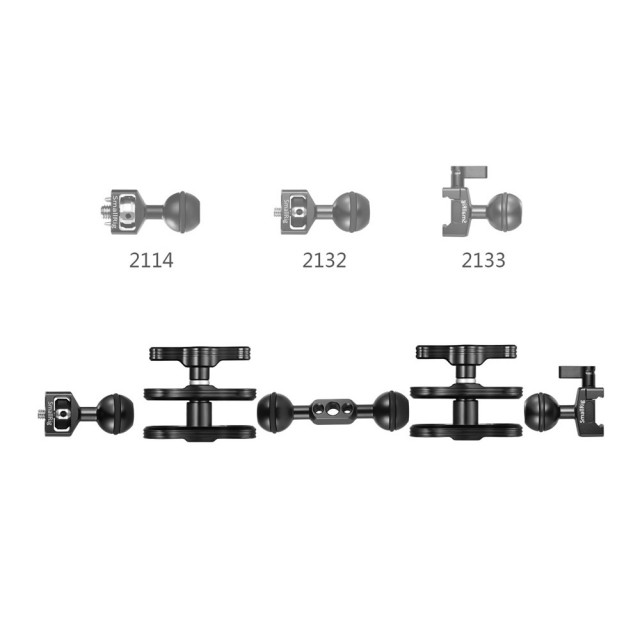 SmallRig Ballhead with NATO Clamp 2133 v kombinaci se svorkou Smallrig Ballhead Clamp 2134 může spolupracovat s dalším příslušenstvím kulové hlavy, jako jsou 2114, 2132 a 2108, a dosáhnout tak dalších vlastních konfigurací. Je ideální pro montáž příslušenství s rychloupínacími lištami NATO, jako je horní deska 1853, boční deska 1854 a klece pro kamery a monitory, jako je 1834/1726/1788.