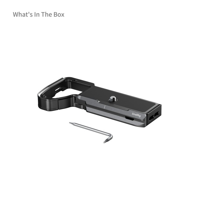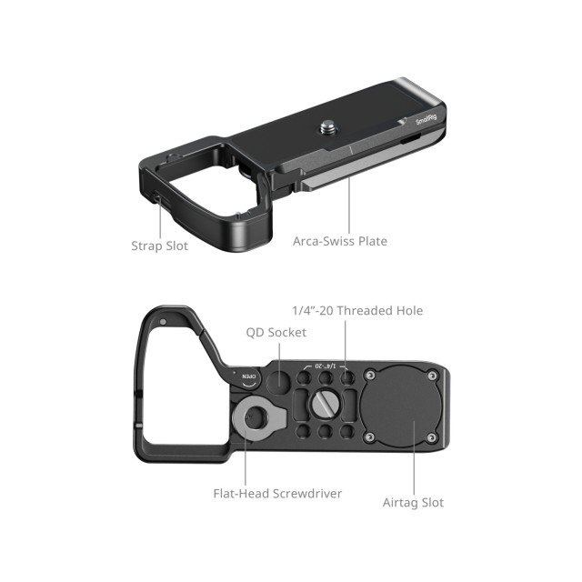 K fotoaparátu se připevňuje pomocí šroubu 1/4"-20 a je vybavena ochrannými podložkami, které zabraňují poškrábání a deformaci. Tato montážní deska je vybavena slotem pro AirTag, který umožňuje připevnění sledovacího zařízení AirTag a plynulé sledování fotoaparátu. Navíc je vybavena kloubovým ramenem v prostoru pro baterie, které zlepšuje ergonomii a poskytuje oporu pro malíček.