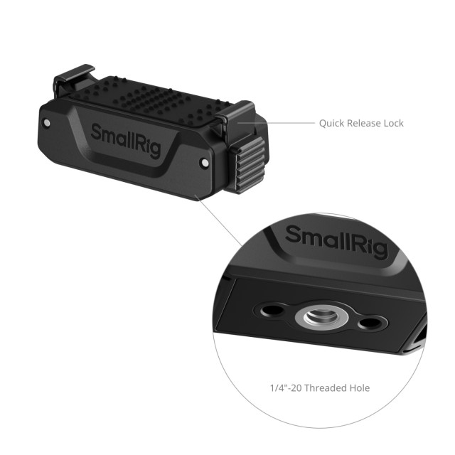 SmallRig Bidirectional Quick Release Adapter Support s 1/4"-20 závitovým otvorem poskytuje bezpečné, stabilní a rychlé upevnění pro profesionální fotografy a kameramany. Je určený pro aknčí kamery DJI Osmo Nano a Osmo Action 6.