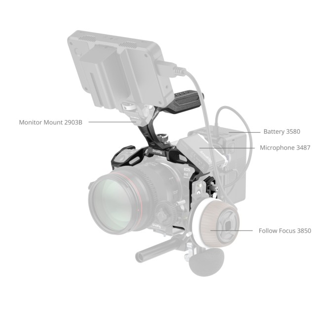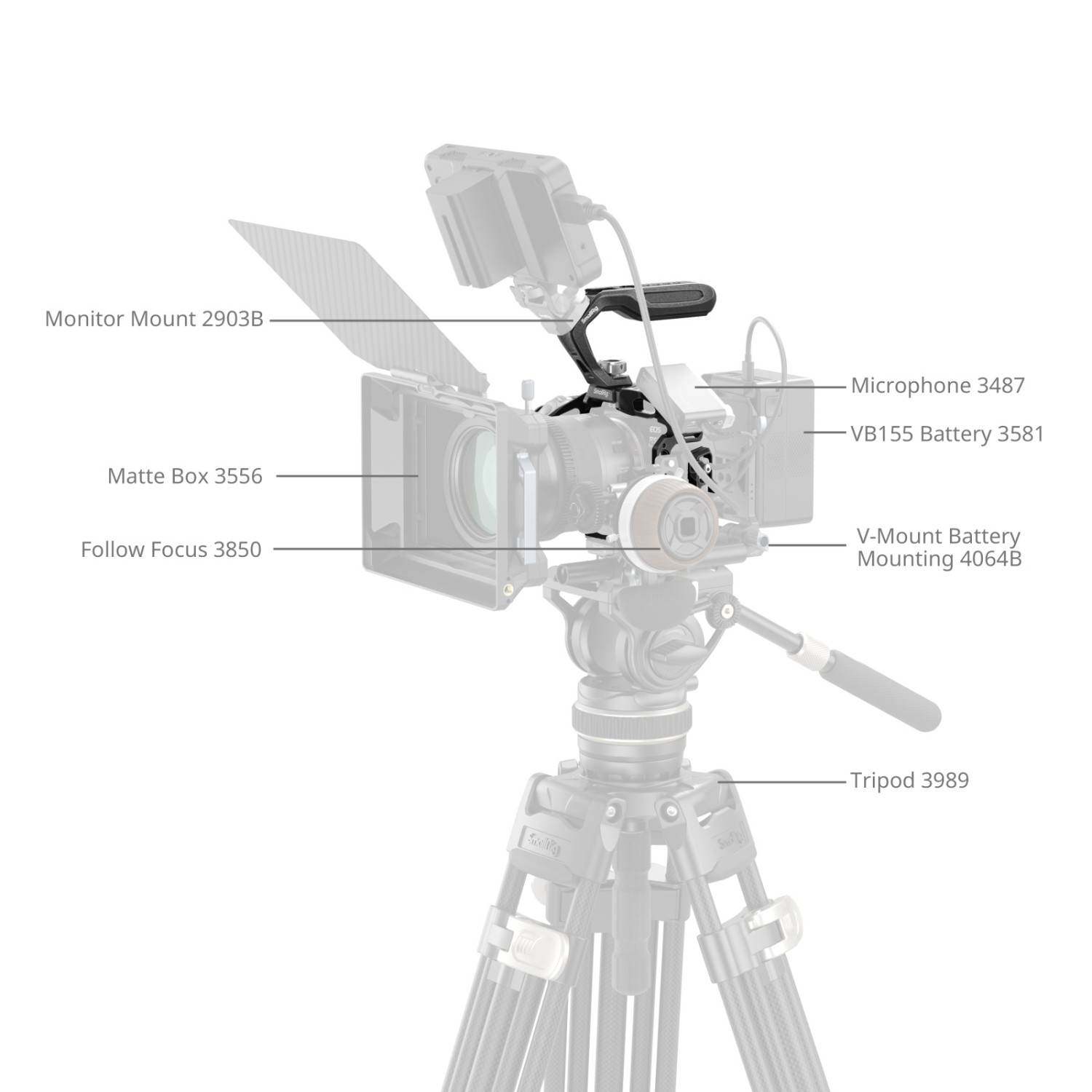 Ergonomická horní rukojeť poskytuje pohodlný úchop, díky čemuž je fotografování z nízkého úhlu a snadné přenášení hračkou. Klec má několik montážních bodů, včetně závitových otvorů 1/4"-20, polohovacích otvorů 1/4"-20, závitových otvorů 3/8"-16, polohovacích otvorů ARRI 3/8"-16, držáku studené patky, rozhraní kompatibilního s Arca, zásuvky QD a slotů pro popruhy. Tyto univerzální možnosti umožňují uživatelům připevnit monitory, mikrofony, stativy, systémy follow focus, rukojeti a další příslušenství, což podporuje širokou škálu potřeb při tvorbě videa.