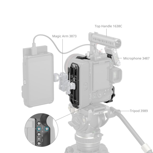 Přední polohovací otvor 1/4"-20 kompatibilní se svorkou pro jednu tyč (ID 3276) umožňuje připevnění jedné 15mm tyče a podporuje příslušenství, jako je follow focus. Kromě toho je vybaven otvorem pro řemínky na zápěstí (ID 3848, 2456) a zdířkou QD pro ramenní popruhy (ID 4118). Navíc vestavěný dvouhlavý klíč ve spodní části zajišťuje snadnou montáž a demontáž.