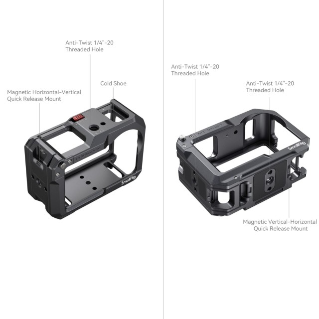 Tato klec je vybavena otvory se závitem 1/4"-20 a držákem na studenou patku, který umožňuje připojit příslušenství, jako jsou mikrofony, světla a další, a vylepšit tak vaše nastavení. Magnetický rychloupínací systém umožňuje snadné přepínání mezi horizontálním a vertikálním režimem, kompatibilní s originálním rychloupínacím adaptérem pro snadné přechody.