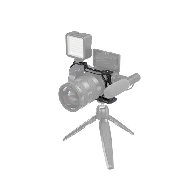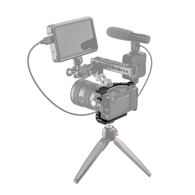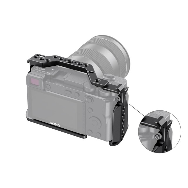 Klec SmallRig pro Sony A6600 CCS2493 je navržena tak, aby poskytovala ochranu a montážní závity pro příslušenství, jako jsou monitory, mikrofony, světla a rukojeti. Klec se upevňuje ke spodní části fotoaparátu pomocí spodního šroubu 1/4"-20 a šroubu M2,5, aby se zabránilo jejímu zkroucení. Je vybavena několika otvory pro příslušenství 1/4"-20, 3/8"-16 a Arri 3/8"-16, které umožňují montáž horní rukojeti 2165, držáku monitoru 2294 a držáku monitoru 2348. Integruje dva držáky studené patice s jedním nahoře a druhým vlevo pro mikrofon a světlo. Klec je navíc na obou stranách vybavena otvory pro popruh na přenášení. Spodní část je dodávána s plochým šroubovákem pro rychlou instalaci. Volitelná svorka kabelu HDMI 1693 a podpěra adaptéru objektivu 1787 se v případě potřeby prodávají samostatně.