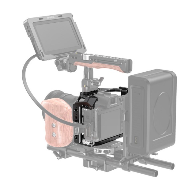 Klec SmallRig pro Sony A7R IV CCS2416 je tvarovaná plná klec. Fotoaparát se upevňuje pomocí šroubu 1/4 na spodní straně a šroubu M2,5 na boku. Je vybaven několika otvory se závity 1/4'-20 a 3/8'-16, polohovacími otvory ARRI, vestavěnou lištou NATO a patkou umožňující montáž různého příslušenství. Můžete například namontovat horní rukojeť SmallRig 1984, polohovací rukojeť SmallRig ARRI 2165 nebo dřevěnou boční rukojeť SmallRig 2187 pro natáčení z ruky a připevnit kabelovou svorku SmallRig 1679 pro ochranu kabelu HDMI. Dodává se s upevňovacími body pro ruční popruhy a popruhy na krk. Přiložený plochý šroubovák ve spodní části je určen k utažení nebo odpojení kamery. Klec zachovává plný přístup k tlačítkům, portům a baterii fotoaparátu.