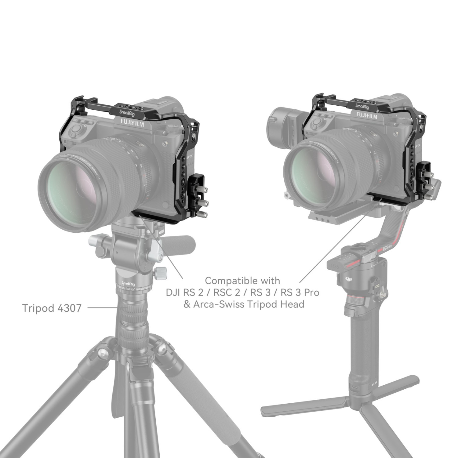 Sada SmallRig Cage Kit pro fotoaparát FUJIFILM GFX100 II 4201 je určena k ochraně fotoaparátu a upevnění příslušenství. Sada obsahuje klec a svorku pro kabely HDMI a USB-C. Klec, která zajišťuje fotoaparát FUJIFILM GFX100 II pomocí jednoho šroubu 1/4"-20 na spodní straně a jednoho bočního zajišťovacího adaptéru na obou stranách, je vybavena gumovými podložkami, které zabraňují poškrábání. Ponechává prostor pro EVF, chladicí ventilátor FAN-001 a poskytuje plný přístup k tlačítkům, slotům na karty, výklopnému displeji a bateriovým dvířkům. Mezi jeho montážní body patří závitový otvor 1/4"-20, polohovací otvor ARRI 3/8"-16, lišta NATO, studená patka a polohovací otvor 1/4"-20. Podporuje boční rukojeť 2093C / 4016 / 3847, horní rukojeť 3765, držák monitoru 2903 / 2904, mini V Mount Battery Plate 2987, svorka na jednu tyč 3598, Magic Arm 3873, mikrofon 3468, LED video světlo 4055 atd. Nechybí ani otvory pro popruhy pro ruční popruh 3848 a ramenní popruh 3485, QD úchyty pro ramenní popruh 4118 a spodní rychloupínací destička Arca Swiss pro stativy typu Arca nebo gimbaly DJI RS 2 / RSC 2 / RS 3 / RS 3 Pro pro rychlé přepínání mezi režimy gimbalu, ručního držení a stativu. A svorka kabelu HDMI a USB-C, zajištěná šroubem s palcem, pomáhá zajistit stabilní přenos signálu.