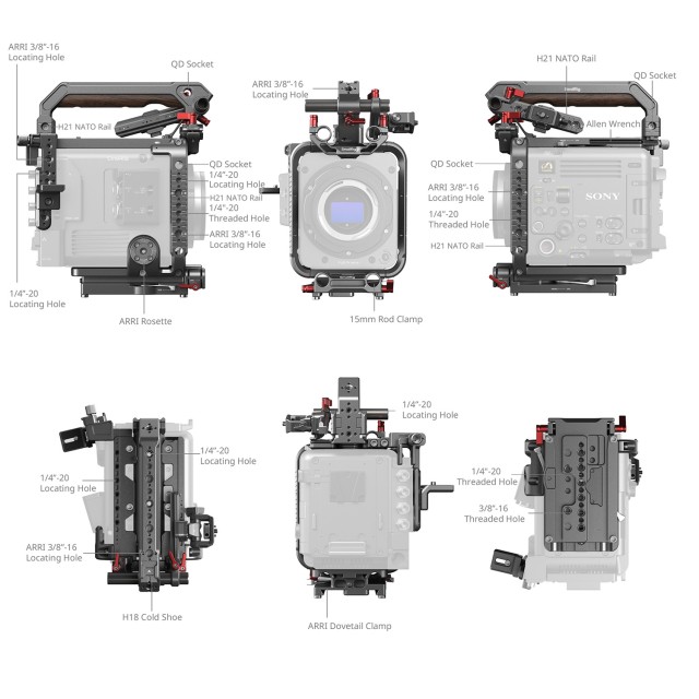 Sada SmallRig Cage Kit pro kameru Sony BURANO 4571 je určena k ochraně kamery Sony BURANO a k připevnění příslušenství. Využívá celoplošnou konstrukci, která účinně chrání tělo fotoaparátu. Horní rukojeť je navržena s pohodlným ergonomickým designem s dřevěným materiálem pro pohodlné uchopení a prvotřídní texturou; podporuje rychlou instalaci a nastavení dopředu/dozadu pro snadné nastavení těžiště a snadnější uchopení. Držák monitoru nahrazením původního držáku monitoru pro dosažení rychlého přepínání mezi režimem LCD a režimem hledáčku, konstrukce HawkLock napomáhající rychlému nastavení. Horní modulární 15mm svorka s dvojitou tyčí je vhodnější pro fotografování z ruky, snadno rozšiřuje follow focus a další příslušenství, ve srovnání s použitím 15mm základní desky LWS je těžiště nižší, což snižuje tlak na stativovou hlavu. Svorka kabelu HDMI pro ochranu rozhraní a stabilitu přenosu signálu a řešení montážní konzoly pro bezdrátový přenos videa pro kompaktní instalaci bezdrátového přenosu videa. 15mm základová deska LWS s rychloupínací konstrukcí, lze rychle namontovat na spodní část klece, vhodné pro přepínání více scén. Sada obsahuje vestavěné závitové otvory ARRI 3/8"-16, polohovací otvory 1/4"-20, závitové otvory 1/4"-20, závitové otvory 3/8"-16, zásuvky QD, kolejnice H21 NATO, studené botky H18, svorku ARRI Dovetail atd. a může tak rozšířit řadu příslušenství pro profesionální tvorbu. Horní rukojeť a 15mm základní desku LWS rychle rozeberete a nainstalujete bez použití nářadí pro pohodlné skladování a přenášení.