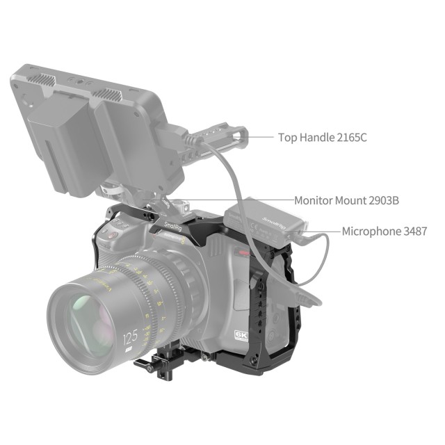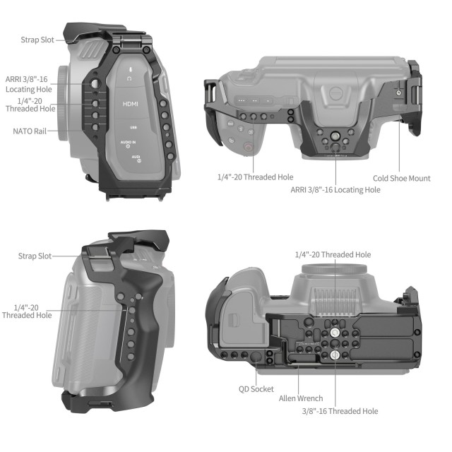 Klec SmallRig pro kameru Blackmagic Design Cinema Camera 6K 4785 je určena pro natáčení z ruky s plynulým pohybem kamery. Chrání kameru a zároveň poskytuje různé možnosti rozšíření. Tříbodový zajišťovací systém zajišťuje kameru dvěma šrouby 1/4"-20 na základně a šroubem 1/4"-20 na horní straně, zatímco integrované silikonové podložky zabraňují poškrábání. Klec nabízí volný přístup ke všem rozhraním fotoaparátu, slotům na karty, výklopnému displeji a prostoru pro baterii. Podpěra adaptéru objektivu je kompatibilní s adaptéry Sigma MC-31, Sigma MC-21 a podobnými adaptéry objektivu, což zabraňuje poškození bajonetu fotoaparátu. Klec je vybavena otvory se závitem 1/4"-20, otvory se závitem 3/8"-16, lokalizačními otvory ARRI pro upevnění příslušenství, jako jsou boční rukojeti(2093, 4016), horní rukojeti(2165C), držáky monitoru(2903, 2904), základové desky Manfrotto(1280, 2458), stativy(3989) a další. Integrované otvory se závitem 1/4"-20 a 3/8"-16, lokalizační otvory ARRI a držák studené patky navíc umožňují připevnění příslušenství, jako jsou magická ramena(3873), kabelové svorky(3271, 3289, 2960) a ochranné kryty rozhraní, které zabraňují ztrátě signálu. Dva otvory se závitem 1/4"-20 na rukojeti zabraňují zkroucení fotoaparátu při orientaci na výšku. Posuvník na levé straně umožňuje rychlé upevnění otočných úchytů (3847), úchytů posuvníku (4017) a usnadňuje rychlou montáž příslušenství. Vestavěné úchyty pro studenou patici umožňují montáž mikrofonů, LED videosvětel, držáků pro SSD (ID 3272) a dalších zařízení. Je také vybaven řemínkovými rozhraními kompatibilními se zápěstními řemínky(3848) a ramenními popruhy(2793). Rozhraní QD umožňuje bezproblémovou integraci s rychloupínacími ramenními popruhy QD(4118). Klec lze přeměnit na poloviční pouzdro pro nastavení stabilizátoru, což zajišťuje snadné vyrovnání. Klec je navíc ve spodní části vybavena magnetickým imbusovým klíčem, který usnadňuje montáž a demontáž příslušenství.