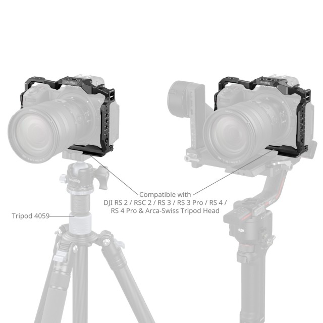 Klec SmallRig Camera Cage pro Nikon Z 6III 4519 je navržena tak, aby poskytovala ochranné pouzdro a univerzální možnosti rozšíření fotoaparátu. Klec bezpečně upevňuje fotoaparát pomocí šroubu 1/4"-20 ve spodní části a dvou šroubů M2,5 po stranách, zatímco integrované podložky zabraňují poškrábání. Poskytuje volný přístup ke všem rozhraním fotoaparátu, slotům na karty, výklopnému displeji a bateriovým dvířkům. Klec je vybavena různými možnostmi rozšíření, například otvory se závitem 1/4"-20, otvory se závitem 3/8"-16 a lokalizačními otvory ARRI, kompatibilními s bočními úchyty (ID 2093, 4015), horními úchyty (ID 3765, 2165C), držáky monitorů (ID 2903, 2904), stativy (ID 4465, 3989), držáky powerbank (ID 2336) a bateriovými deskami mini V-mount (ID 2987). Vestavěné polohovací otvory 1/4"-20 na bocích umožňují připevnění příslušenství, jako je svorka na jednu tyč (ID 3598), magické rameno (ID 3873) a boční rukojeť (ID 4346). Na levé straně je zabudovaná lišta NATO pro rychlé připevnění a odpojení bočních rukojetí (ID 3847, 4017). Integrované úchyty studené patky podporují mikrofony, LED videosvětla a další. Obsahuje vestavěný slot pro zápěstní řemínek pro použití se zápěstními řemínky (ID 3848, 2456) a také integrované rozhraní QD kompatibilní s ramenním popruhem (ID 4118). Rychloupínací destička Arca-Swiss na spodní straně je kompatibilní se stativy typu Arca (ID 4060, 4353) a gimbaly DJI RS 2 / RSC 2 / RS 3 / RS 3 Pro / RS 4 / RS 4 Pro, což umožňuje snadný přechod mezi gimbaly, natáčením z ruky a ze stativu. Plochý klíč se dvěma hlavami na základně navíc zjednodušuje montáž a demontáž.