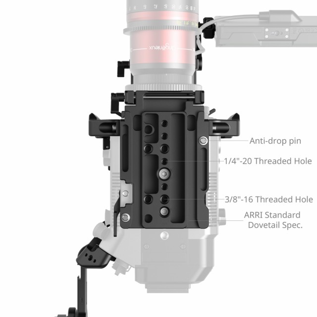 Na horní část klece lze připevnit magická ramena (ID 3875, 3874) a 15mm svorky pro jednu tyč (ID 4171) pro připevnění bezdrátových vysílačů, monitorů a audio přijímačů podle potřeby. Standardní základová deska ARRI s dvojitou 15mm LWS tyčovou svorkou umožňuje rychlé nastavení bez použití nástrojů pomocí páčky. Spodní část základové desky je vybavena protipadacími kolíky, standardní základovou deskou ARRI a závitovými otvory 1/4"-20 a 3/8"-16 pro kompatibilitu se standardními základovými deskami ARRI a můstkovými deskami ARRI BP8 19mm.