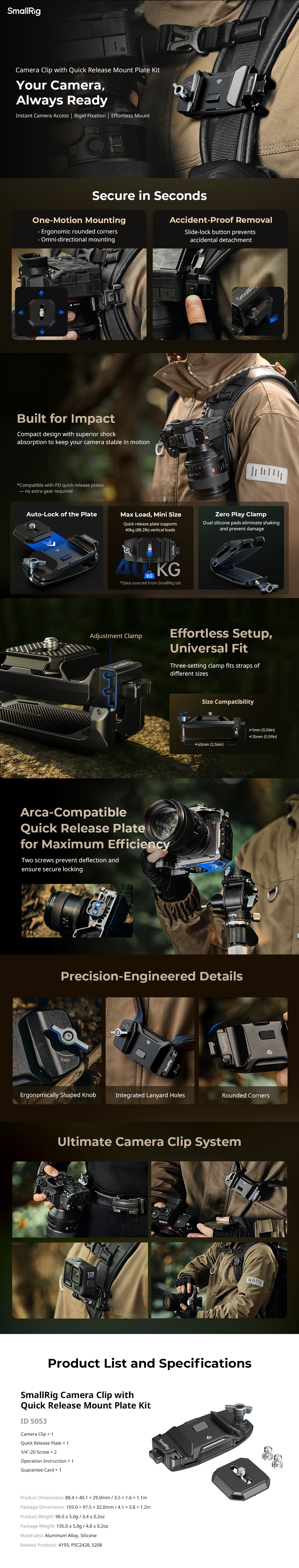 Sada SmallRig Camera Clip with Quick Release Mount Plate 5053 je speciálně navržena pro fotografy, kteří jsou neustále v pohybu. Sada obsahuje klip na fotoaparát, rychloupínací destičku a šroub 1/4''-20 a nabízí uživatelsky přívětivý design: rychloupínací destičku lze zasunout v libovolném směru a automaticky se zajistí na místě. Podporuje také jednočinné uvolnění, což zajišťuje vysoce efektivní montáž a demontáž.