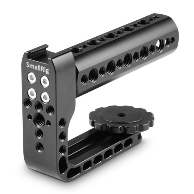 SmallRig Long Lens Carry Handle (Cheese) 1732 is a simple and lightweight handle suitable for any long lens. It attaches to the tripod collar or the top plate of a cage with a 1/4"-20 thumbscrew. The knurled knob is larger than the pad so you can turn it easily. The 63mm sliding slot allows forward and backward adjustment to balance your setup. There is a shoe mount on top of the grip for attaching accessories, such as shoe-mount style video lights, flashes, microphones. In addition, there are 18 x 1/4"-20 accessory holes on the sides. The rubber-coated pad could lessen stress on the screw, and the handle will not turn like it would if it was metal to metal.