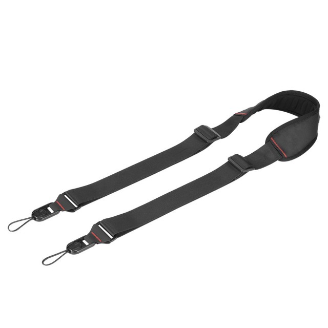 Délka popruhu je nastavitelná, maximální délka je 160 cm a minimální délka je 110 cm, aby vyhovovala lidem různých velikostí. Unikátní systém Rapid Link umožňuje rychlé připevnění/odepnutí popruhu a poskytuje vašemu fotoaparátu bezpečnější způsob nošení. Popruh je dodáván s destičkou QR, která je kompatibilní se stativy Arca-Swiss i Manfrotto® RC2. Čtyři otvory pro šňůrky na čtyřech rozích lze použít k připojení konektorů Rapid Link pro více způsobů přenášení fotoaparátu.