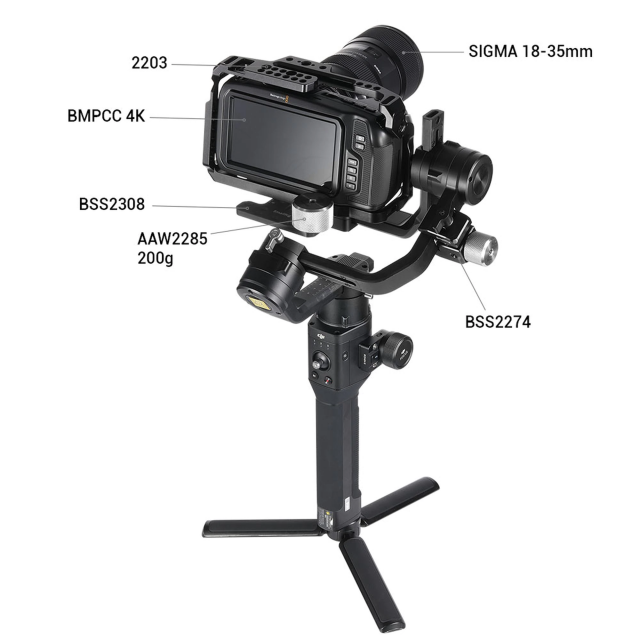 Tato montážní deska umožňuje nasadit na fotoaparát delší objektiv. Kromě toho má na přední straně otvor se závitem 1/4"-20, do kterého se vejde originální opěrka objektivu dodávaná s kamerou Ronin S. Volitelná boční svorka 2274 s protizávažím umožňuje vyvážit gimbal jako druhé řešení, zejména pro BMPCC 4K