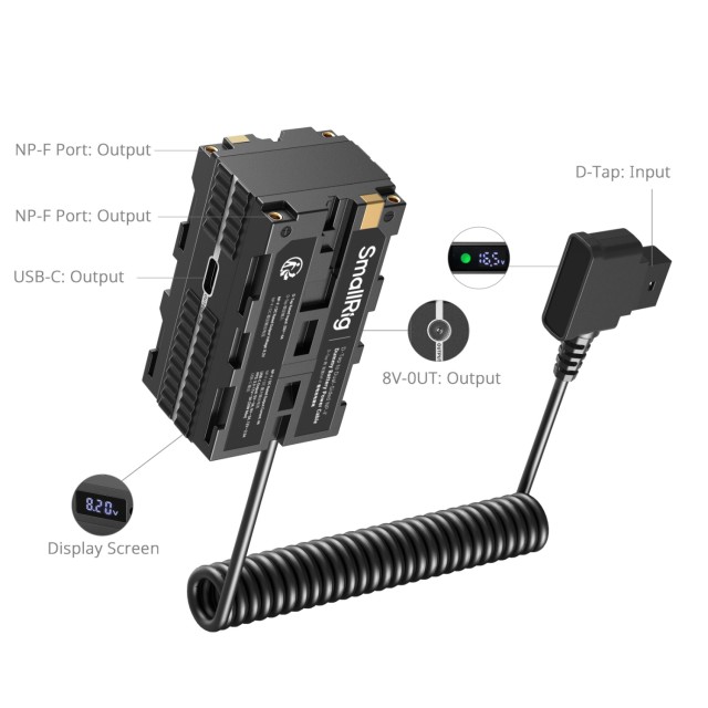 Napájecí kabel SmallRig D-Tap na oboustrannou atrapu baterie NP-F 4884 je multifunkční napájecí kabel na atrapu baterie s jedním vstupem D-Tap a čtyřmi výstupy: dvěma výstupy NP-F, jedním stejnosměrným výstupem a jedním výstupem USB-C, který umožňuje současné nabíjení čtyř zařízení. Výstupy NP-F napájejí monitory a video vysílače, stejnosměrný výstup napájí fotoaparáty prostřednictvím fiktivních baterií a výstup USB-C napájí zařízení, jako jsou motory pro následné zaostřování a mobilní telefony.
