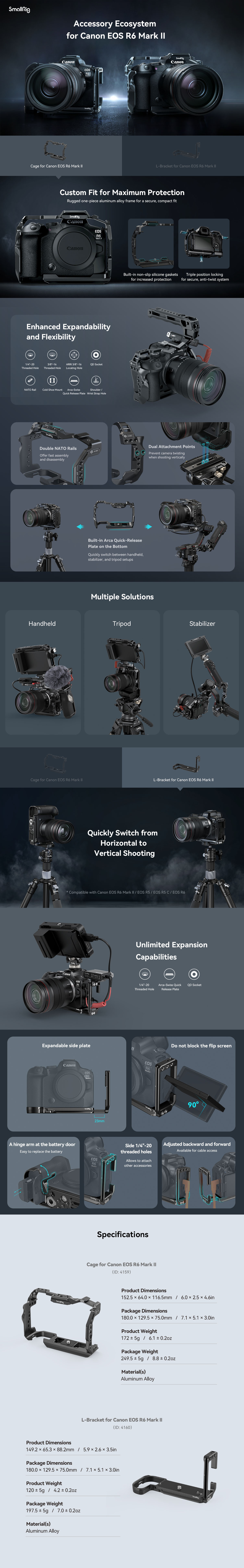 Držák SmallRig L-Bracket pro Canon EOS R6 Mark II / R5 / R5 C / R6 4160 je navržen tak, aby usnadňoval přepínání mezi horizontálním a vertikálním režimem a zlepšoval zážitek z držení. Zajišťuje fotoaparát pomocí jednoho šroubu 1/4"-20 ve spodní části a dvou polohovacích kolíků, s gumovými podložkami zabraňujícími poškrábání, a má rameno závěsu u bateriových dvířek, které se přizpůsobí zakřivení fotoaparátu, aby se zlepšil úchop. K dispozici je několik úchytů pro příslušenství: rychloupínací destička Arca-Swiss pro stativy typu Arca nebo stabilizátory DJI RS 2 / RSC 2 / RS 3 / RS 3 Pro, otvory se závitem 1/4"-20 ve spodní části, které podporují boční rukojeť 2093 pro vertikální snímání z ruky, rychloupínací destička 1280 a otvory pro popruh pro ruční popruh 3848. Deska je také vybavena zásuvkou QD pro připojení systému Quick Disconnect System pro ramenní popruh, otvory se závitem 1/4"-20, vhodnými pro Cold Shoe Mount BUC2736 pro mikrofon, a také roztažitelnou boční deskou, která umožňuje průchod kabelů při vertikálním snímání, a 90stupňovým otočením výklopné obrazovky s konstrukcí se zářezem. Kromě toho je součástí balení magnetický klíč pro snadnou demontáž a montáž.
