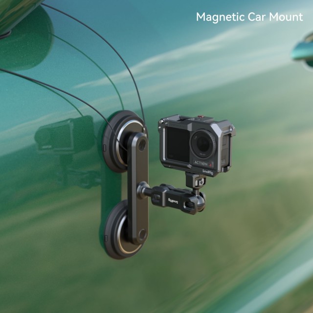 Sada SmallRig Dual Magnetic Suction Cup Mounting Support Kit for Action Cameras 4467 je určena k natáčení scén v autě pomocí akční kamery. Doporučuje se používat pouze na rovných železných površích, jako jsou železné dveře, zábradlí, kuchyňské nádobí, sportovní vybavení atd. Exkluzivní konstrukce ze dvou materiálů kombinuje magnety s vakuovou přísavkou, což zajišťuje bezpečnější, dlouhodobější a stabilnější natáčení. I v nepravděpodobném případě úniku silikonové přísavky v důsledku silných vibrací mohou magnety přitáhnout celou montážní podpěru k povrchu železného vozu (v rámci nosnosti 0,35 kg / 0,8 lb v dynamické scéně natáčení s rovnou silnicí, kdy maximální rychlost nepřekročí 120 km/h nebo 74 km/h), čímž účinně zabraňují riziku pádu způsobenému únikem silikonové přísavky. Sada obsahuje magnetickou přísavku pro každou nohu, magické rameno a držák akční kamery. Šroub 1/4"-20 na jednom konci umožňuje připevnit akční kameru, monitor, LED video světlo, mikrofon atd. a vestavěné gumové kolíky podporují SmallRig 3084C, 3083C, 4088B, 4119B a další příslušenství s polohovacími otvory, které zabraňují vychýlení.