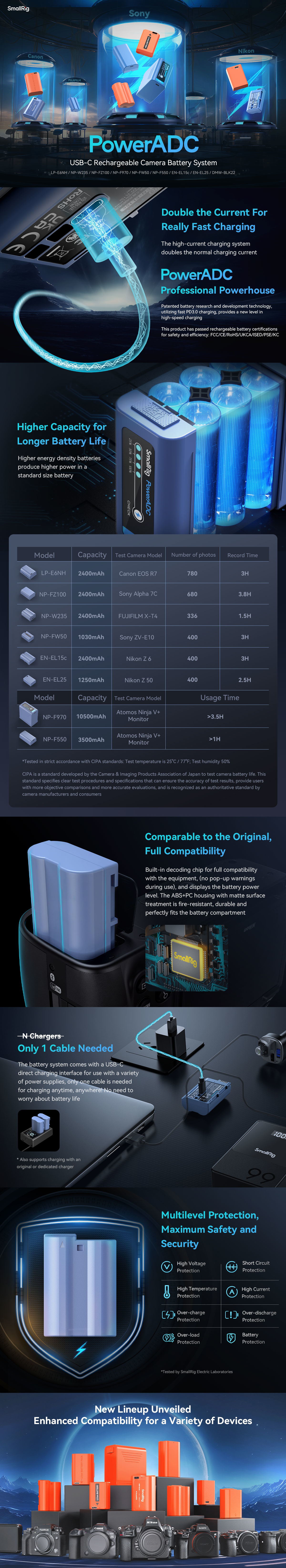 Nabíjecí baterie SmallRig EN-EL15c USB-C pro fotoaparáty 4332B je vybavena portem USB-C pro nabíjení prostřednictvím powerbanky, napájecího pásku, nabíječky do auta nebo speciální nabíječky. Díky nabíjení vysokým proudem (5 V 2A) a jmenovité kapacitě 2400 mAh můžete baterii naplnit za 2,5 hodiny a provozovat zařízení delší dobu. Tato vizuálně výrazná baterie, která je plně dekódovaná bez vyskakovacích oken, má ohnivzdorný, odolný plášť z ABS a PC s matným povrchem, který působí jemně na dotek. Má naprosto stejnou velikost jako originální baterie fotoaparátu, tudíž se nemusíte obávat, že se zasekne.