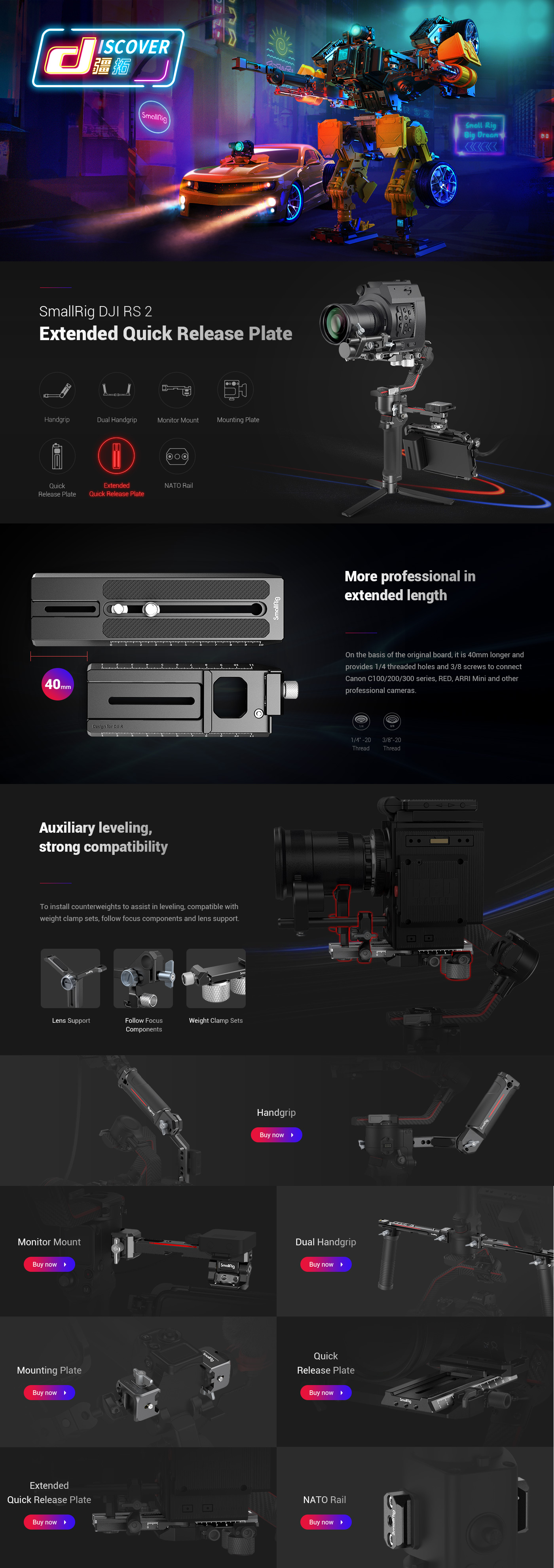 Rozšířená rychloupínací destička SmallRig pro DJI RS 2 / Ronin-S / RS 3 / RS 3 Pro 3031B je určena k upevnění profesionálních kamer, jako jsou Canon C100/200/300, RED a Komodo, na gimbal. Prodloužená destička přidává 40 mm oproti původní destičce pro kameru.