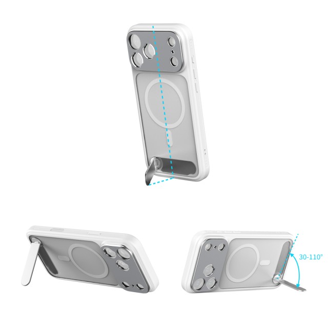 Pouzdro je navrženo pro optimální funkčnost a je přesně sladěno s ovládacím tlačítkem fotoaparátu iPhone, což poskytuje citlivou hmatovou odezvu a zároveň zajišťuje komplexní ochranu. Integrovaná multiúhlová podpěra (30°-110°) umožňuje snadný přechod mezi orientací na výšku a na šířku. Vestavěné magnety MagSafe zajišťují univerzální kompatibilitu s příslušenstvím MagSafe, zatímco boční otvor pro poutko usnadňuje připevnění zápěstního nebo ramenního popruhu pro pohodlné přenášení na cestách.